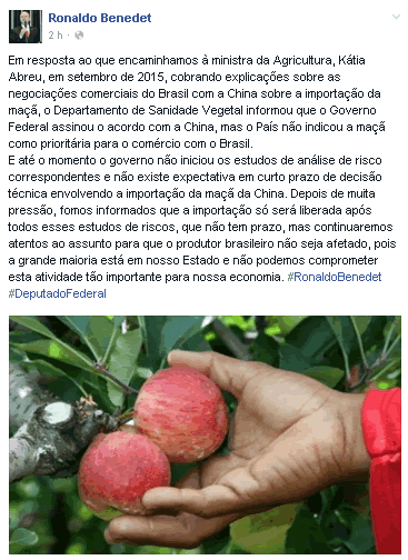 16 fev 16/02/2016 – Deputado Federal Ronaldo Benedet em Defesa da Pomicultura Brasileira Postado às 21:14h em Maçã é tudo de bom por ABPM 0 Comentários 0 Curtidas Publicado em 16/02/2016, 17h00 Fonte: https://www.facebook.com/RonaldoBenedet/ Tags: ABPM Audiências com Autoridades, Seguro Agrícola