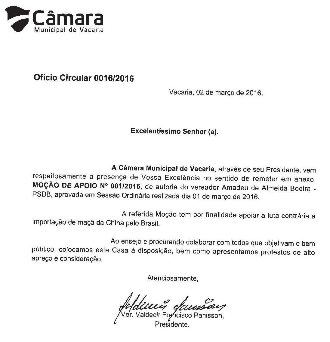 ABPM recebeu correspondência em ofício comunicando a aprovação da Moção n. 01/2016 tratando do apoio ao Segmento da Maçã no que tange à contrariedade dos vereadores do município quanto a importação de maçãs da China.