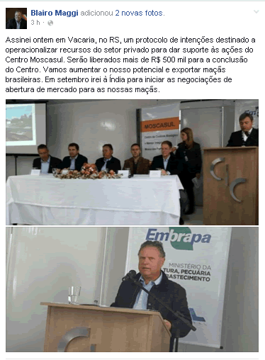 Ministro Blairo Maggi publicou sobre sua visita ao Setor Maçã: assinatura do protocolo de intenções do Centro Moscasul; liberação de mais de 500 mil para o a conclusão do Centro; aumento do potencial das exportações de maçã e a abertura do mercado da Índia à maçã brasileira.