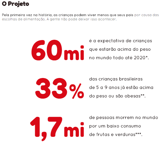 Mal saiu do mapa da fome no mundo, o Brasil entrou no mapa da obesidade e já apresenta queda na expectativa de vida das pessoas, pela primeira vez na história moderna. Diante desse cenário, a plataforma de inovação social em comportamento de consumo Novos Urbanos desenvolveu uma campanha nacional para estimular o consumo de frutas, legumes e verduras e influenciar a agenda e as políticas públicas em relação à nutrição e a alimentação.